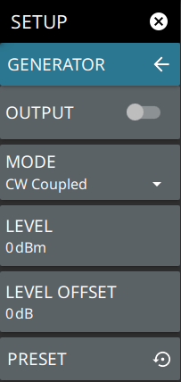 ![]() | OUTPUT Slide the toggle to turn the generator on/off. Source output power level can be set using LEVEL. MODE Selects one the following generator modes: • Sweep: Generates a swept signal with an output frequency equal to the tuning frequency of the spectrum analyzer. • Offset Sweep: Generates a swept signal with an output frequency modified by a selected offset, relative to the tuning frequency of the spectrum analyzer. • CW Fixed: Generates a continuous wave (CW) signal with a fixed output frequency. • CW Coupled: Generates a CW signal with an output frequency equal to the center frequency of the spectrum analyzer. LEVEL Sets the source output power level (in dBm). It corresponds to actual output power setting regardless of any external gain or loss setting. LEVEL OFFSET Sets the source output offset value or external gain/loss (in dB).Note that changing this value adjusts the displayed output power in accordance with the set offset. For example, if the output power is set to –25 dBm, and if the external gain/loss is then set to 10 dB external gain, then the power limits will be adjusted by 10 dB, and the value of the output power that is displayed on the instrument will be adjusted to –15 dBm. The range is from –100 dB to +100 dB. A negative offset indicates an external loss, and a positive value indicates an external gain. CW FIXED FREQ Sets source output frequency when the generator mode is set to CW Fixed. PRESET Presets all the set parameters to default values. |