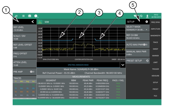 1. The status panel provides quick access to common spectrum analyzer settings. See STATUS PANEL (SEM). 2. SEM Mask 3. Spectrum Emission 4. SEM Mask 5. All SEM measurement parameters are set via the SETUP menu. See SETUP Menu (SEM). |
