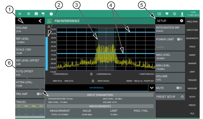1. The status panel provides quick access to common spectrum analyzer settings. See STATUS PANEL (PIM/Interference). 2. A vertical bar corresponds to the received signal strength within the integration bandwidth. 3. Dashed vertical lines and a shaded region define the received channel integration bandwidth. 4. Horizontal blue lines define the audio response range for the measurement. 5. All signal power measurement parameters are set via the SETUP menu. See SETUP Menu (PIM/Interference). 6. Interference setup parameters and measurement results are shown in a table at the bottom of the display. |