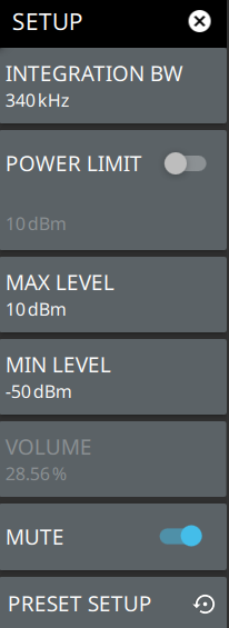![]() | INTEGRATION BW Sets the range of integration used in calculating the received power. The integration bandwidth is displayed as the shaded region between the bandwidth start and stop thresholds (dashed green lines). POWER LIMIT The power limit is the threshold value used to determine whether the actual measured channel power will pass or not. If the measured channel power exceeds the set power limit, the channel power test fails; otherwise, the test passes. Pass/fail test results are shown in the measurement results table. MAX LEVEL Sets the upper level for the audio response of the measurement. This setting is useful for adjusting the resolution of the tone changes. Power levels above the MAX LEVEL will continue to emit sound an increasingly higher pitch. MIN LEVEL Sets the lower level for the audio response of the measurement. The MIN LEVEL also functions as a squelch. Power below this level will not emit a sound. VOLUME Sets the volume level for the audio response of the measurement. Note that the system volume can affect the range of this setting. Refer to PIM/Interference (Option 24). MUTE ALL Mutes the volume of the instrument. PRESET SETUP Presets all values on the SETUP menu to default values. |