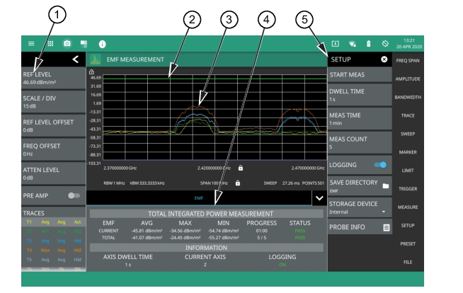 1. The status panel provides quick access to common spectrum analyzer settings. See STATUS PANEL (EMF Measurement). 2. EMF measurement pass/fail status uses a limit line for the test criteria. You can use either a custom limit line or toggle the International Commission on Non-Ionizing Radiation Protection limit. Either limit supports the same features as in the SPECTRUM ANALYZER mode. See LIMIT Menu. 3. The trace display area shows traces for the following measurements in units/m2: • Trace 1: Current axis sweep data • Trace 2: Current isotropic result • Trace 3: Average isotropic result • Trace 4: Maximum isotropic result • Trace 5: Total average isotropic result Note that trace detectors and trace averaging are disabled for the EMF measurement. 4. Tabular measurement data shows the current and total EMF measurement results, the current test progress, and the pass/fail status. The information area shows the axis dwell time, the current axis being measured, and the data logging state. 5. Use the SETUP menu to configure the EMF measurement settings. See SETUP Menu (EMF). |