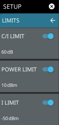 ![]() | C/I LIMIT Sets the carrier-to-interference ratio limit in dB. Enter the desired C/I ratio (dB) limit value using the numeric keypad. POWER LIMIT Sets the desired value of the carrier power limit. Enter the desired carrier power (dBm) limit value using the numeric keypad. I LIMIT Sets the desired value of the interference power limit. Enter the desired interference power (dBm) limit value using the numeric keypad |