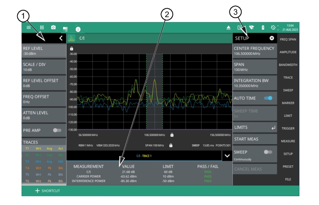 1. Status panel provides quick access to all the spectrum analyzer menu settings. See STATUS PANEL (C/I). 2. The C/I table shows the carrier-to-interference ratio (dB), carrier power and interference power measured in dBm.The Pass/Fail status is populated only if the limits are toggled on in LIMITS menu. 3. The SETUP menu is where the C/I settings are configured. See SETUP Menu (C/I). |