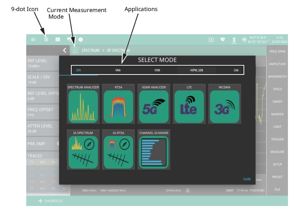 1. Status Panel: Each measurement features a unique status panel that displays settings and information relevant to the current measurement and view settings. Refer to the Status Panel, for more information. 2. Markers: Markers are displayed as green diamonds on the trace to which they are assigned. The active marker is shown as a solid green diamond with a dashed vertical line. The marker amplitude and frequency will be displayed in green text on the top left edge of the display. In this example, a marker is shown at the signal peak with the marker table enabled. Double tap the marker to open a quick access peak search menu. 3. Limit Lines: Limit lines are shown as red (failing) or green (passing) lines with gray circles for each limit line point. Limit lines can be set up point-by-point or by using the envelope feature to quickly set a sloped or square envelope. The currently selected limit line point is shaded in gray. When limit lines are enabled, a pass/fail status is shown in the upper right of the window. If the trace crosses the limit, the trace color will turn red and the limit will indicate a failure. The limit is only applied to the active trace (see Section 3-7 “Setting Trace Parameters”), which is indicated next to the pass/fail. 4. Measurement Settings: The x-axis shows the start, center, and stop frequencies. The y-axis displays the amplitude of the graticule lines. RBW/VBW, span, sweep time, and number of trace point settings are shown along the bottom of the spectrum display. If either resolution bandwidth or video bandwidth is set to manual, the “#” symbol will precede its label. If an offset frequency is entered, the offset value is displayed in the left side status panel. Selecting any of the editable parameters opens the keypad to edit the value directly. Information-only displays cannot be changed. 5. Multiple Trace Display: Each trace has a unique color and each can be set to Clear/Write, Average, Min or Max Hold, Rolling Average, Rolling Min or Max Hold, T1-T2, T2-T2. Traces can have Peak, RMS/Average, Negative, Sample, or Normal detectors. Traces can be set to Active, Hold/View, or Blank. |