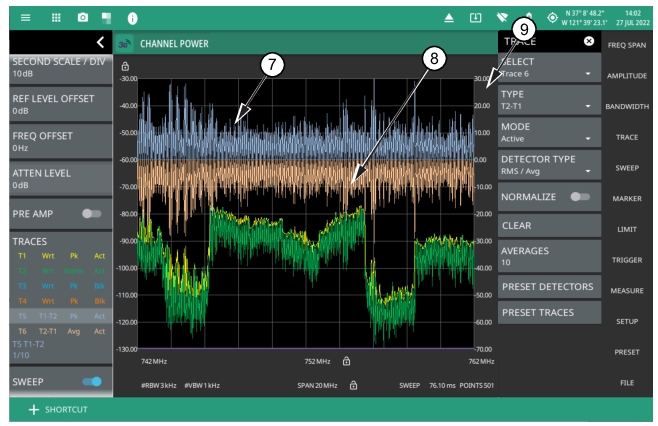 ![]() | SELECT Selects traces 1 through 6. Selecting a trace that is off turns the trace on. The trace type will be Clear/Write, the trace mode will be Active, and the detector type will be Peak. Selecting a trace will draw the trace on top of all other traces. This feature is not available in the spectrogram measurement view because all spectrogram data is created from a single trace. TYPE Selects one of the following types of traces: • Clear/Write: Clears the trace after each sweep is complete and writes a new trace. • Average: The exponential average of all N traces, where N is the AVERAGES number set below. The number of sweeps is displayed in the status panel TRACES table. • Max Hold: Represents the maximum value since sweeping began. The number of sweeps is displayed in the status panel TRACES table. • Min Hold: Represents the minimum value since sweeping began. The number of sweeps is displayed in the status panel TRACES table. • Rolling Average: Is the rolling average of the last N traces, where N is the AVERAGES number set below. The number of sweeps is displayed in the status panel TRACES table. • Rolling Max Hold: Is the maximum rolling average value of the last N traces, where N is the AVERAGES number set below. The number of sweeps is displayed in the status panel TRACES table. • Rolling Min Hold: Is the minimum value of the last N traces, where N is the AVERAGES number set below. The number of sweeps is displayed in the status panel TRACES table. TRACE MODE Selects one of the following trace modes: • Active: Displays the selected trace as it is updating. • Hold/View: Displays the trace and it is not updating. It displays the last sweep from when the trace mode was set to hold/view. If the frequency or bandwidth settings are changed while a trace is in hold/view mode, the data will be blanked from the screen. In order to see data again, set the trace mode to active. • Blank: Does not display the trace and is not updating. It is the same as if the trace was off. NORMALIZE Toggles the trace normalization on/off. Note that when the toggle is turned on selected trace in the status panel is indicated by a subscript of the letter ‘N’. Refer to Figure: Trace Normalization |