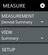 - ![]() | MEASUREMENT Selects the desired measurement type from the following list: • WCDMA: Displays the current beam measurement status in a quick-view summary that includes the PCI and received power measurement summaries. See WCDMA Demod Summary. • Channel Power: Provides an RF channel power measurement that includes the total channel power, power spectral density (PSD), and pass/fail compliance testing. See WCDMA Channel Power. • OBW: The occupied bandwidth table and channel lines are added to the measurement display. Refer to WCDMA Occupied Bandwidth. • ACP: The ACP table and channel lines are added to the measurement display. Refer to WCDMA Adjacent Channel Power. • SEM: The spectrum emissions mask table and a spectrum mask is added to the measurement display. Refer to WCDMA Spectrum Emission Mask. VIEW WCDMA measurement supports the following two views: SETUP Opens one of the measurement SETUP menus. The WCDMA SETUP menus can be access directly via the SETUP or MEASURE menus after the desired measurement has been selected. The setup menu depends on the current measurement and view selected. |