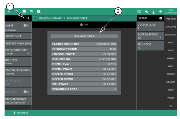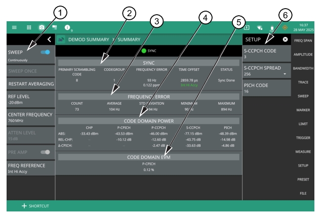 1. WCDMA Analyzer Status Panel: Each measurement features a unique status panel that displays settings and information relevant to the current measurement and view settings. This panel provides quick access to the sweep setting, center frequency and reference level. See STATUS PANEL (WCDMA Demod Summary). 2. SYNC: This section consists of primary scrambling code, code group, frequency error and a sync status. 3. Frequency Error: This section shows the frequency error of all the measured signals. It is the difference between the measured carrier frequency and the specified carrier frequency. This measurement is only as accurate as the frequency reference that is used and is typically only useful with a good external frequency reference or GNSS (GPS). It consists of the following data: • Count: The total number of frequency measurements included in the averaging measurement. • Average: The average value of all frequency measurements made. • Standard Deviation: The measure of the spread of frequency measurements. The standard deviation is the average difference of all measurements from the average frequency measurement. Typically 68% of all measurements will fall within the standard deviation value shown. • Minimum: The single lowest frequency value measured. • Maximum: The single highest frequency value measured. 4. Code Domain Power: This section shows the code domain power. It consists of the following data: • CHP: Channel power limit is the amplitude of limit on channel power. • P-CPICH: It is the power of common pilot channel (CPICH) for WCDMA code domain demodulation measurements. • P-CCPCH: It is the channelization code number of the Primary Common Control Physical Channel (P-CCPCH) for WCDMA code domain demodulation measurements. • S-CCPCH: It is the channelization code number of the S-CCPCH channel for WCDMA code domain demodulation measurements. • PICH: It is the channelization code number of the Paging Indicator Channel (PICH) channel for WCDMA code domain demodulation measurements. 5. Code Domain EVM: It is a specific type of EVM measurement that assesses the modulation quality of the signal across individual code channels section. It is represented as the percentage of P-CPICH EVM power. 6. Setup Menu: The setup menu includes S-CCPCH code, S-CCPH spreading factor drop-down and PICH code. See SETUP MENU (WCDMA Demod Summary). |