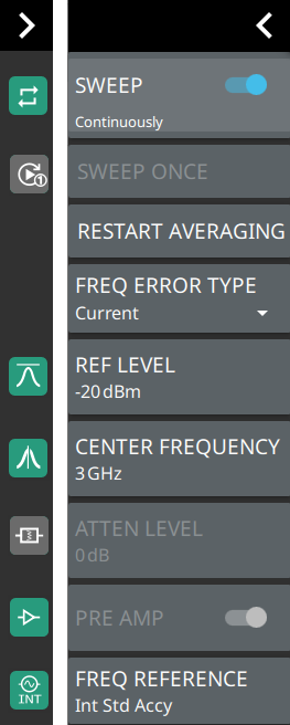 ![]() | SWEEP: Toggles the current sweep setting between continuously or sweep once. SWEEP ONCE When sweep is set to single sweep, SWEEP ONCE updates the measurement display. Data continues to be captured in the background. RESTART AVERAGING Restarts the average frequency error value of the all the frequency measurements made. FREQUENCY ERROR TYPE Selects the frequency error type as either current or average. Shows the current frequency error value when CURRENT is selected. Shows the average of frequency error of all the measured channels. Note that this is only available in WCDMA summary table view. REF LEVEL Sets the reference level of the top graticule line in the selected units. If the reference level offset is not zero, OFFSET REF LEVEL is displayed at this location. Refer to Setting Amplitude. CENTER FREQUENCY Sets the center frequency of the measurement channel. ATTEN LEVEL Manually sets the attenuation level. This feature is not available when auto range or auto attenuation is enabled. PRE AMP Turns the low-noise front-end preamplifier on or off. To ensure accurate measurement results, the largest signal into the instrument input when the preamplifier is turned on should be less than –40 dBm. The preamplifier cannot be turned on if auto attenuation is on and the reference level is above –40 dBm. FREQ REFERENCE Indicates the current frequency reference source of Internal, External, or GNSS (GPS) Hi Accuracy (requires GPS). The instrument automatically selects the frequency reference in the following order of priority: external, GNSS (GPS), then the internal time base. |