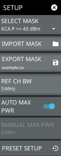 ![]() | SELECT MASK Selects the desired upper/lower or custom emission mask. Choose the desired mask from the list. IMPORT MASK Used to import a custom user mask. EXPORT MASK Exports an example user mask as a comma separated value file (see Example Custom Signal Emission Mask) or exports the currently selected custom mask. REF CH BW Sets the reference channel bandwidth for the measurement. AUTO MAX PWR Toggles automatic max power. Some segments in the mask are dependent on the main channel power. Enabling this automatically calculates the reference channel power by measuring the channel power of the center channel bandwidth. When disabled, the reference power must be entered manually below. MANUAL MAX PWR Used to manually enter the reference channel power for masks that have limits dependent on main channel power. PRESET SETUP Presets all values on the SETUP menu to default values. |