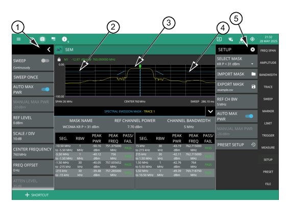 1. The status panel provides quick access to common spectrum analyzer settings. See STATUS PANEL (SEM). 2. SEM Mask 3. Spectrum Emission 4. SEM Mask 5. All SEM measurement parameters are set via the SETUP menu. See SETUP Menu (SEM). |