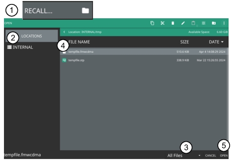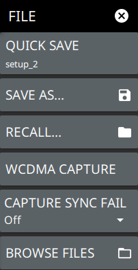 ![]() | QUICK SAVE saves a setup file immediately with the name shown in the button. The number in the name is incremented automatically so that the new name is ready for the next setup file to be saved. SAVE AS Opens the Save dialog to manually enter a file location, enter a file name, and to set the file type to be saved. Depending on the selected measurement, you can save the following: • Setup: Saves the current instrument setup (stp file type). • Trace: Saves the measurement point (trace) data and the current instrument setup (fmwcdma file type). • Trace CSV: Saves the visible trace point data in comma separated value format (csv file type). This format is useful for further analysis using other software tools. • Screenshot: Saves a screenshot of the current measurement (png file type). • Trace + Screenshot: Saves both the current measurement and screenshot files (both fmwcdma and png file types). RECALL Opens the Recall File dialog to retrieve a file from a desired location. Only supported files will be displayed depending on the currently set measurement. When trace data is recalled, the instrument will change the settings to match the settings of the saved trace. The data will be recalled to the appropriate trace. That trace will be in a Hold mode. To exit the recalled data, simply change the trace mode back to Active. WCDMA CAPTURE Initiates a digitized WCDMA data capture at the selected bandwidth. WCDMA captures are saved to the internal storage space in the captures folder (bin file type). This feature is meant to help identify WCDMA signal characteristics during early development. CAPTURE SYNC FAIL Automatically initiates a digitized WCDMA data capture when synchronization fails. The setting can be configured to capture just a single event or repeat events. WCDMA captures are saved to the internal storage space. BROWSE FILES Refer to “File Management” section of Instrument Overview chapter of the user guide. |