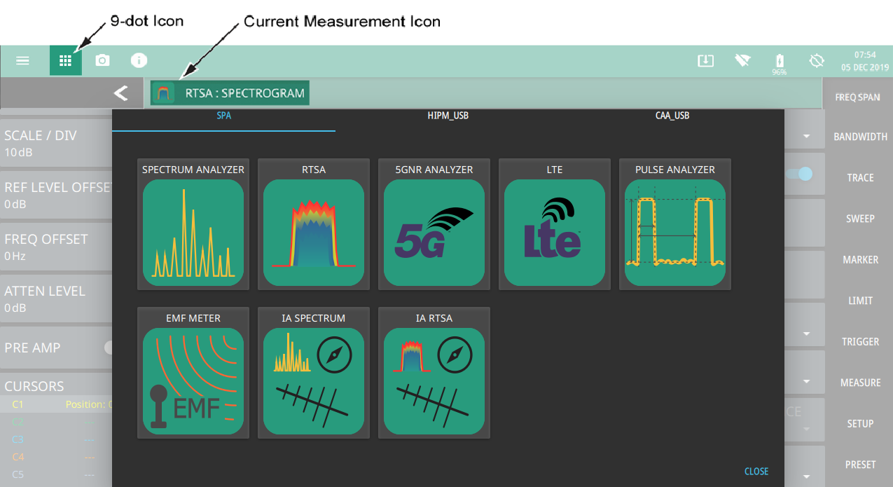 The instrument analyzers are selected from the 9-dot icon or the current measurement icon at the top of the display area. To select an analyzer, press the 9-dot icon in the title bar or the current measurement icon to display the available analyzers, illustrated in