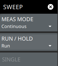 ![]() | MEAS MODE Sets the measurement to Continuous or Single mode. Continuous will cycle through the average count continuously. Single will cycle through the average count just once and then switch to Hold mode. Single measurements must be triggered each time by using the Single button below. RUN/HOLD Sets the current measurement to Run or Hold. In Run mode, the power meter takes measurements according to the MEAS MODE setting. In Hold mode, the power meter finished the current measurement and then stops measuring. SINGLE Triggers a measurement when the MEAS MODE is set to Single. |