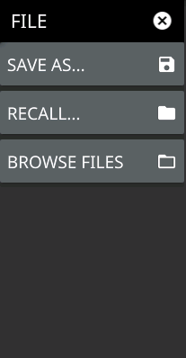 ![]() | SAVE AS Opens the Save dialog to manually enter a file location, enter a file name, and to set the file type to be saved. Depending on the selected measurement, you can save the following: • Setup: Saves the current instrument setup (stp file type). • Measurement: Saves the measurement point data and the current instrument setup (fmhipm file type). • CSV: Saves the point data in comma separated value format (csv file type). This format is useful for further analysis using other software tools. • Screenshot: Saves a screenshot of the current measurement (png file type). RECALL Opens the Recall File dialog to retrieve a file from a desired location. Only supported files will be displayed depending on the currently set measurement. When measurement point data is recalled, the instrument will change the settings to match the settings of the saved measurement. The data will be recalled with the measurement in Hold mode. To exit the recalled data, simply change the measurement mode back to Run from the SETUP menu. BROWSE FILES Opens “File Management” section of Instrument Overview chapter of the user guide |