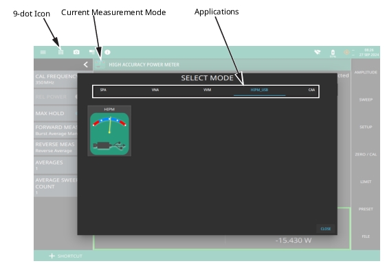The instrument applications/modes are selected from the 9-dot icon or the current application/mode icon. To select an application/mode, press the 9-dot icon in the title bar or the current application icon to display the available applications and modes, illustrated in