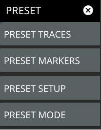 The PRESET menu sets certain settings to the default state. Preset only affects the current analyzer settings, such as those for the spectrum analyzer or for the 5GNR analyzer. Preset does not affect user files or system settings such as networking settings. For other reset options, such as a complete factory reset of the instrument, refer to “Reset Settings” section in Instrument Overview chapter of the user guide. To recover from system software faults, refer to Appendix A, “Instrument Messages and Troubleshooting” chapter of the user guide.