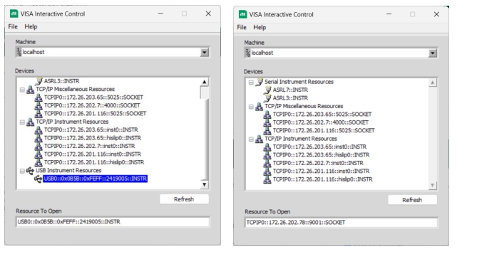 VISA Interactive Control Dialog - USBTMC (left); Ethernet (right)