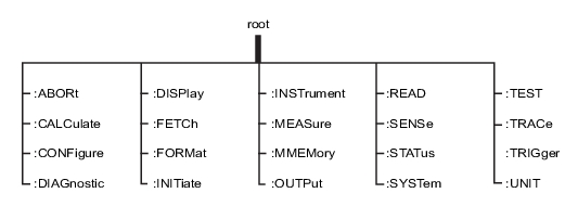 All SCPI commands, except the common commands, are organized in a hierarchical structure similar to the inverted tree file structure used in most computers. The SCPI standard refers to this structure as “the Command Tree.” The command keywords that correspond to the major instrument control functions are located at the top of the command tree. The root command keywords for the SCPI command set are shown in Figure: SCPI Command Tree.