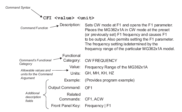 This section provides alphabetically-ordered listings and descriptions of all MG362x1A Native programming commands.