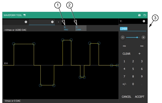 Use the X and Y tabs to enter values. The waveform coordinates can be entered using the numerical keypad as shown in Figure: Add Discrete Value. Here the Y tab is pressed and the numerical value entered will be the Y coordinate for the waveform location.
