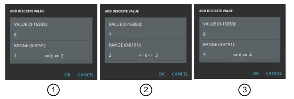 The discrete value method shown in Figure: Add Discrete Value allows a specific value to be set to a range of waveform entries. Once the data is entered, the value is reflected in the waveform drawing. The value entered into the VALUE (0-16383) range sets the Y value. The Value entered into the left tab of the RANGE (0-8191) range is the first X value coordinate. The second value entered into the <= X <= 0 is the second X value of the waveform.