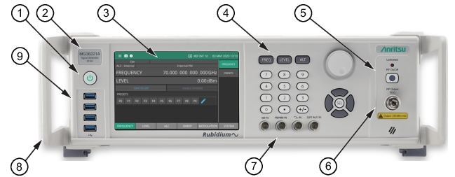 1. Power Button: Press the power button to power the signal generator on and off. Standby (off) is indicated by the white illuminated power button; Operate (on) is indicated by the green illuminated power button. 2. Model Identification Label: Identifies the model type and frequency range. 3. LCD Display: The LCD display provides information about the current status of the MG362x1A in a menu display format. This information includes the operating mode of the instrument and the value of the active frequency and parameters. The display functions as a touch-screen interface to provide access to graphical button controls and additional setting menus. 4. Front Panel Buttons: The front panel buttons provide controls for changing parameter values. 5. RF Output Control Key: The RF output control key turns the RF output power on and off. Output Off is indicated by an orange LED; Output On is indicated by a green LED. 6. RF Output Connector: The RF output connector provides the 50 Ω RF signal output. Before making connections to the RF output connector, see Torque Requirements. 7. Front Panel BNCs: Available with Option 29. Input BNCs are AM IN, FM/ΦM IN, Pulse IN, External ALC IN). 8. Handles: Standard configuration includes handles. 9. USB Interface: Four front panel Type A USB Inputs. |