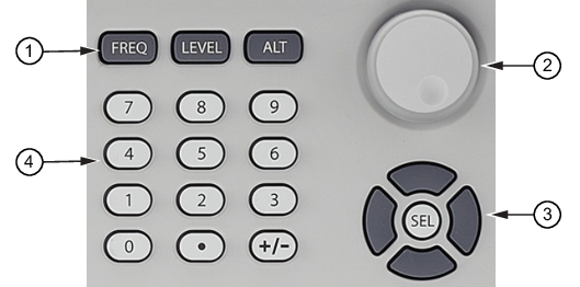 Use the numeric keypad, arrow hard buttons, or rotary data knob to change the MG362x1A parameter values. The data entry area is shown in Figure: Front Panel Controls and described in the following paragraphs.