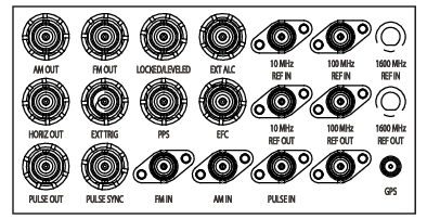 Accepts an external 1600 MHz ± 3.2 kHz or 2 ppm, 4 ± 1 dBm (20 dBm no-damage level) reference signal. Enabled with Option 3 or 13. Automatically disconnects the internal high-stability time-base option, if connected. (50 Ω impedance, SMA type, rear panel)