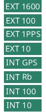 ![]() | Frequency Reference Shows the current frequency reference as an internal or external reference. The frequency references are: EXT 1600: 1600 MHz external signal input EXT 100: External 100 MHz external signal input EXT 1PPS: 1 Pulse Per Second external signal input EXT 10: 10 MHz external signal input INT GPS: Internal GPS signal INT Rb: Internal Rubidium signal INT 100: Internal 100 MHz signal INT 10: Internal 10 MHz signal |