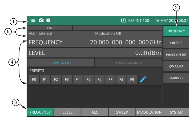 2. Menus are used to configure the main menu measurement settings: FREQUENCY, LEVEL, ALC, SWEEP, MODULATION and SYSTEM and to enable measurement modes and views.