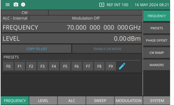 The typical MG362x1A menu display shown in Figure: Frequency Menu Display is used throughout the data entry instructions. At this menu display, you can edit both the CW frequency and the output parameters.