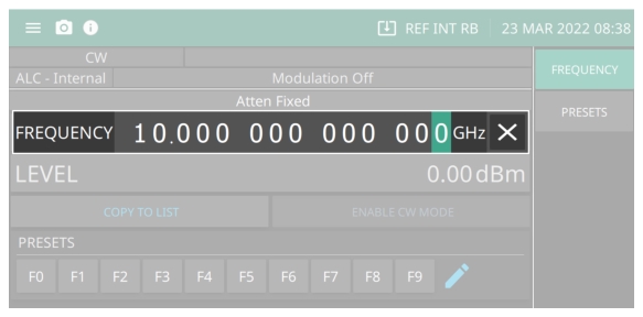 Open a parameter for editing by pressing a function from the main menu. In the following example, to open the frequency function, press FREQUENCY. The menu display changes to show that the frequency parameter has been opened as shown in