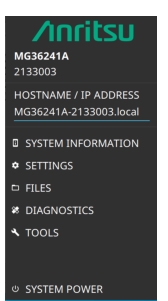 - ![]() | HOSTNAME/IP ADDRESS This field is used to specify the IP address or hostname of an instrument that is connected to the network. When localhost is toggled on, the software will connect locally to provide some UI functionality. Refer to Working with the Localhost for details. SYSTEM INFORMATION See System Menu panel showing instrument, software, and network connection details. SETTINGS See SETTINGS Menu, providing access to all system level settings and controls. FILES See FILES Menu. Note that the file management menus are different from the right-side FILE menu. Use file management to organize, copy, and rename files. Use the right side FILE menu to save and recall measurement data, instrument setup files, or to save a screenshot. DIAGNOSTICS See DIAGNOSTICS Menu. TOOLS: See TOOLS Menu. SYSTEM POWER Opens a dialog to RESTART or POWER OFF the instrument. |