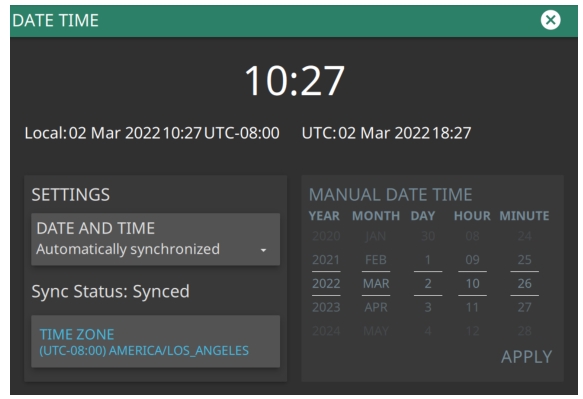 Settings Date and Time: Manually set or Automatically synchronized. Set Manually to activate the MANUAL DATE TIME window. Here you can scroll to a selectable year, month, day, hour, and minute. Automatically synchronized uses the network time; if the instrument also has a GPS location fix, the system will determine and use the more accurate of the two, between network and GPS time. Automatically synchronized mode may take several minutes to sync. Time Zone Select a time zone from the list provided. |