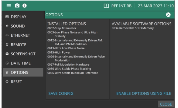INSTALLED OPTIONS Displays the options currently installed. AVAILABLE SOFTWARE OPTIONS Displays options available to download and install. SAVE CONFIGS Opens the Save File dialog. Name and store the file. If upgrading options, use this config file to send to Anritsu as described in Software Option Upgrades. ENABLE OPTIONS USING FILE Searches for a license file from a USB stick and installs those options. See Updating Firmware. |
