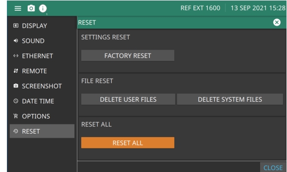SETTINGS RESET FACTORY RESET Restores the instrument to the factory default settings for all measurement modes and system settings, including language and the display and audio settings. Ethernet settings and user files are not affected. The instrument will automatically restart. FILE RESET DELETE USER FILES Deletes all user files from the instrument’s internal memory, including measurement, setup, and screenshot files. System files are not affected. DELETE SYSTEM FILES Deletes all user system files from the instrument’s internal memory, including keyboard EZ names, cable and antenna s, and log files. Other user files are not affected. RESET ALL RESET ALL Performs a Factory Reset as described above and deletes all user files and system files from the instrument’s internal memory. The RESET ALL function overwrites all information stored in the non-volatile memory with default values. This includes the table of 2000 frequency sets used for the sweep mode and the five power-offset tables used for the user level flatness correction function. The sweep is defined by a start index and stop index. The instrument will automatically restart. |
