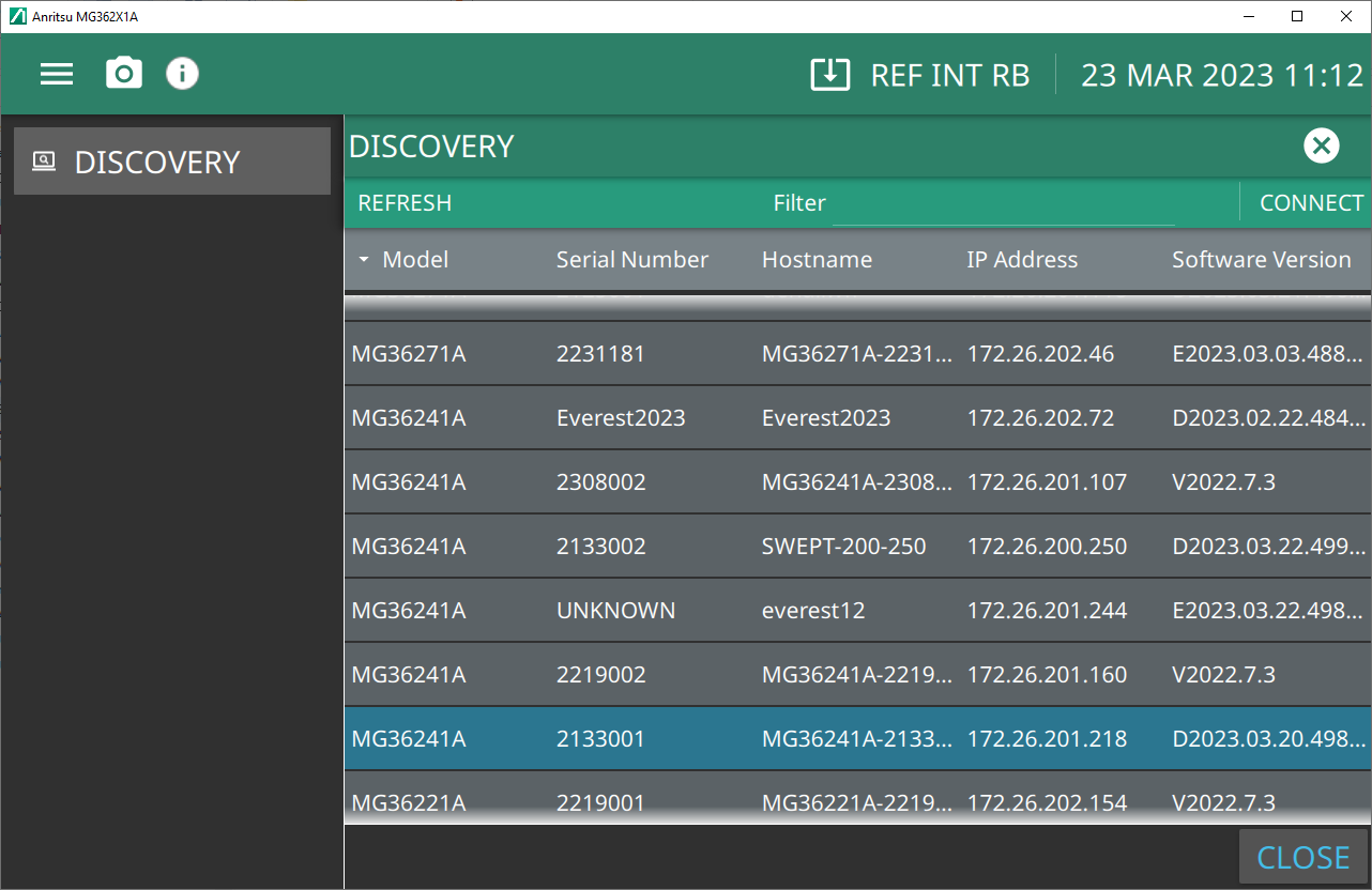 Figure: TOOLS-DISCOVERY Menu. The DISCOVERY screen shows the MG362x1A models connected to your network.