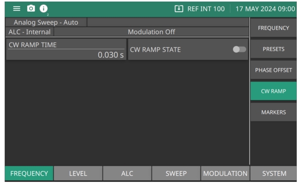CW Ramp is available with Option 6. The CW ramp provides a repetitive 0V to 10V ramp output to the rear panel HORIZ OUT BNC connector and AUX I/O connector, pin 1. While the CW ramp is on, the message CW Ramp appears on the frequency title bar.