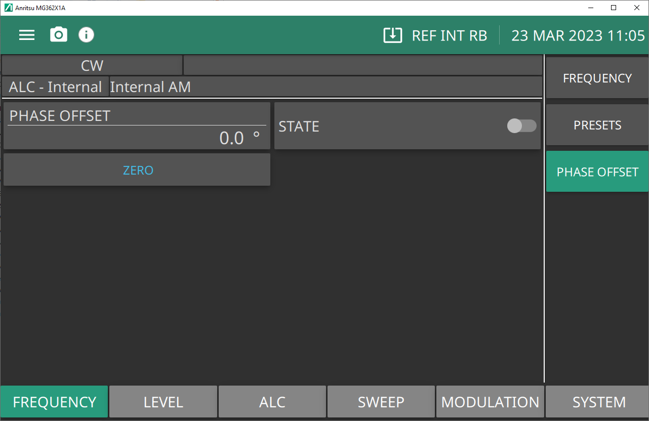 Figure: PHASE OFFSET Menu. The phase offset function is available in CW operating mode only. When active, the MG362x1A RF output will be phase shifted by the specified amount displayed in the phase offset parameter. The phase offset range is -360° to +360° with a resolution of 0.1°. When the phase offset is on, the phase offset value is displayed in the CW menu. To zero the phase offset display from the phase offset menu, press Zero Display.