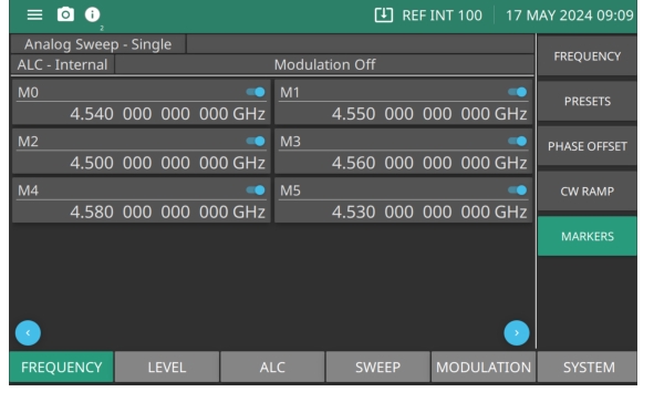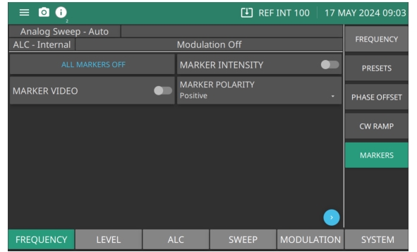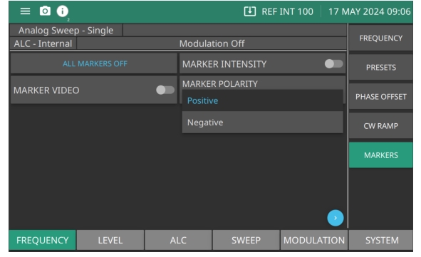 ALL MARKERS OFF Press to turn off all markers. MARKER INTENSITY Produces an intensified dot on the display at each marker frequency. They are obtained by a momentary dwell in the sweep at each marker frequency. Intensity markers are only available in the analog sweep frequency mode at sweep times of < 1 second. To output markers during a sweep you must first select (tag) the marker frequencies. MARKER VIDEO Produces a pulse on the display at each marker frequency. MARKER POLARITY Provides the a +5 V or a –5 V pulse. Set polarity as shown in Figure: MARKER POLARITY. |