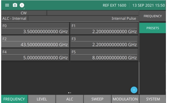 To select one of the preset frequencies for output, press the PRESETS button or press the Edit icon displayed in the Frequency menu shown in Figure: PRESETS Menu.