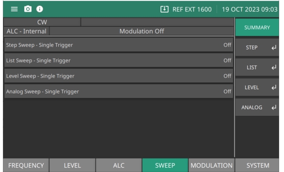 The SUMMARY Menu provides the MG362x1A Sweep On or Off status for Step Sweep, List Sweep, and Level Sweep. Note the status bar displays CW when the Sweep menus are all off. Once a sweep menu is selected, the status bar will display the sweep that is selected.