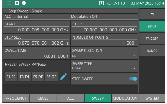 START Set the start frequency of the step sweep. STOP Set the stop frequency of the step sweep. STEP SIZE Set the step size of the step sweep. NUMBER OF POINTS Set the number of points in a step sweep. Range is 2 to 65535. DWELL TIME Sets the sweep per point dwell time. Units are in seconds. Range is 1e-05 seconds to 99 seconds. SWEEP DIRECTION Sets the direction of the sweep up/down. Up = sweeps from start to stop sweep. Down = sweeps from stop to start sweep. PRESET SWEEP RANGES Selects a frequency sweep range preset. Range: F1F2 | F3F4 | F5DF | F6DF SWEEP TYPE Sets the parameter for sweep type to Logarithmic or Linear sweep operation. STEP SWEEP Toggle step sweep on or off. |
