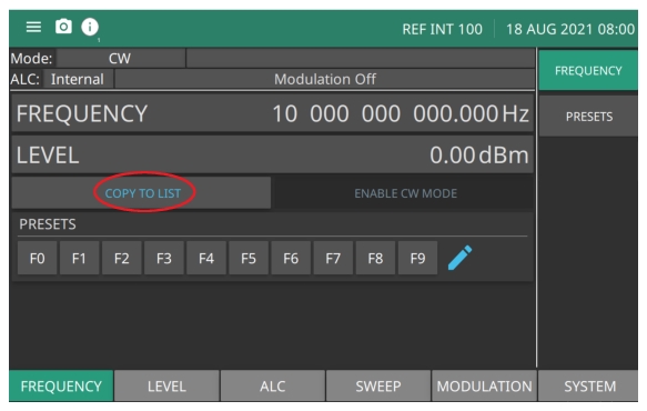 From the main FREQUENCY menu, press the FREQUENCY and LEVEL to edit the parameters. Then press the COPY TO LIST button shown in