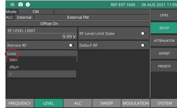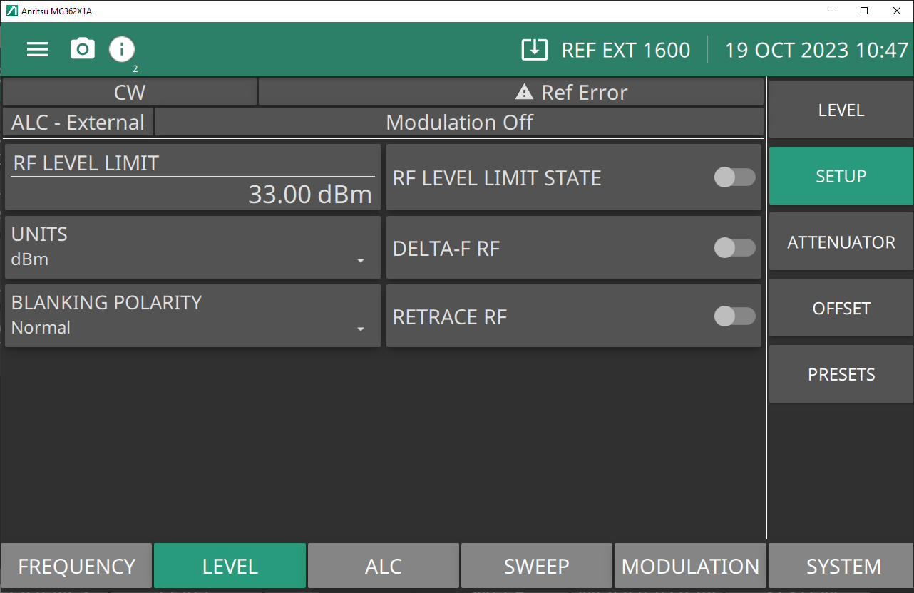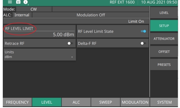 RF LEVEL LIMIT Sets the maximum power level when level limit state is enabled. Range is -130 dBm to 33 dBm with Option 2. Range is –20 to 33 dBm without Option 2. RF LEVEL LIMIT STATE When ON, the level status area displays “Limit” or “Lim”. UNITS Level units, select dBm, dBµV, mV. DELTA-F RF Toggle that controls RF On or Off during frequency switching in CW, Step sweep, and List sweep modes. Toggle Retrace RF Output protection On turns Delta-F RF Off. BLANKING POLARITY Selects the polarity of the signal that turns the RF on during pulse modulation, as follows: Normal: specifies positive-true operation; a TTL-high level will turn on the RF output signal. Inverted: specifies negative-true operation; a TTL-low level will turn on the RF output signal. RETRACE RF Controls the RF output On/Off during retraces. Toggling retrace RF Output protection On turns RF Off during retrace. |