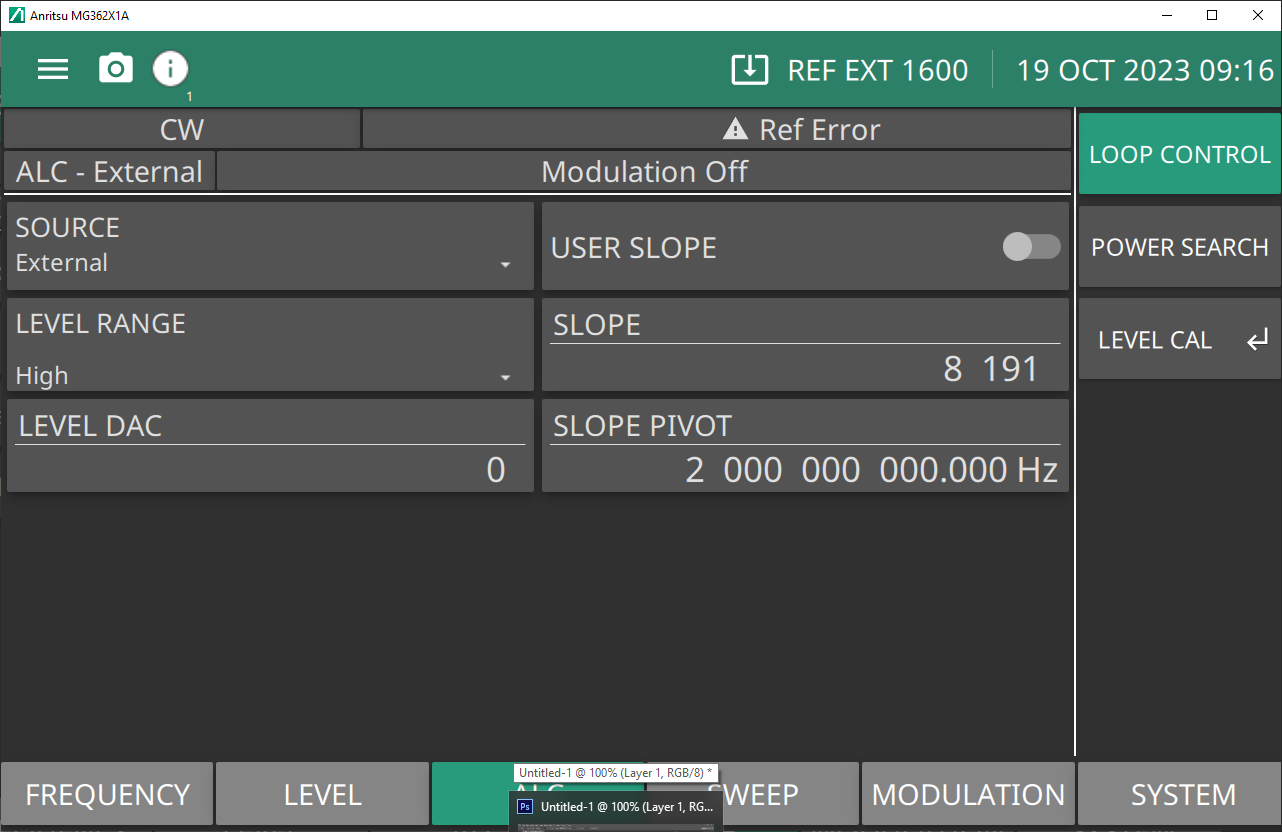 You can select the ALC mode of operation—internal or fixed gain (ALC off). In addition, the signal generator provides a decouple function that allows decoupling of the step attenuator (if equipped) from the level setting. The ALC LOOP CONTROL settings menu is shown in Figure: ALC Loop Control Menu.