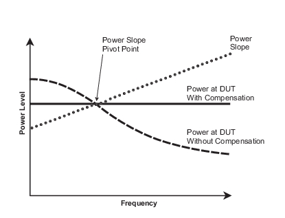 The ALC power slope function lets you compensate for system, cable, and waveguide variations due to changes in frequency. This is accomplished by linearly increasing or decreasing power output as the frequency increases. The example shown in Figure: ALC Power Slope Example, displays how the power slope function provides you with the ability to set both the power slope and the pivot point. The ALC loop menu lets you activate the ALC power slope function.