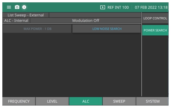 The POWER SEARCH menu provides searching for ALC settings that give the best noise performance. The POWER SEARCH Menu is shown in Figure: POWER SEARCH Menu.