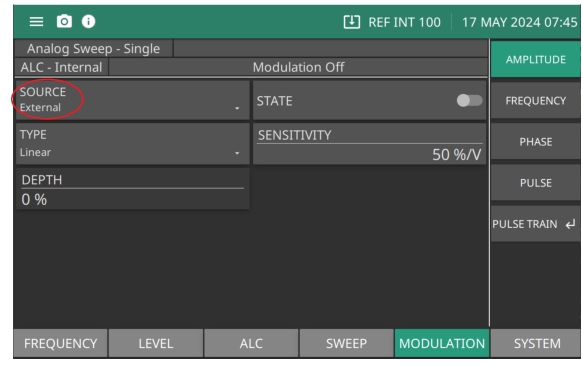 SOURCE Set Internal or External Amplitude modulation. STATE Switch external amplitude modulation on or off. TYPE Set to Logarithmic or Linear AM. • Logarithmic: Displays the DEPTH button to set sensitivity in dB. • Linear: Displays the DEPTH button to set sensitivity in %. SENSITIVITY Available when SOURCE is set to External. Numeric parameter dB/V is active when AM Type is Logarithmic. Numeric value %/V is active when AM type is set to Linear. DEPTH Numeric parameter dB is active when AM Type is Logarithmic. Numeric value %/V is active when AM type is set to Linear. |