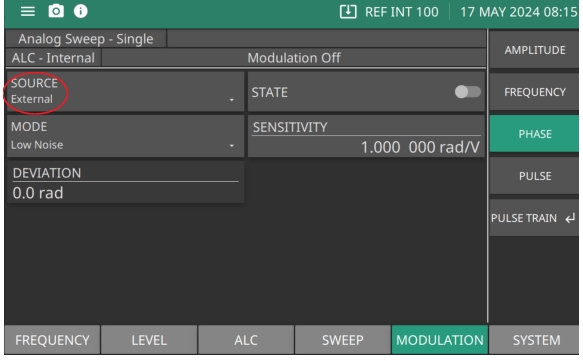 This menu contains the external ΦM status window that shows the current menu selections and the measured ΦM deviation (The ΦM deviation measurement function measures the voltage of the external modulation signal and calculates the peak frequency deviation).
